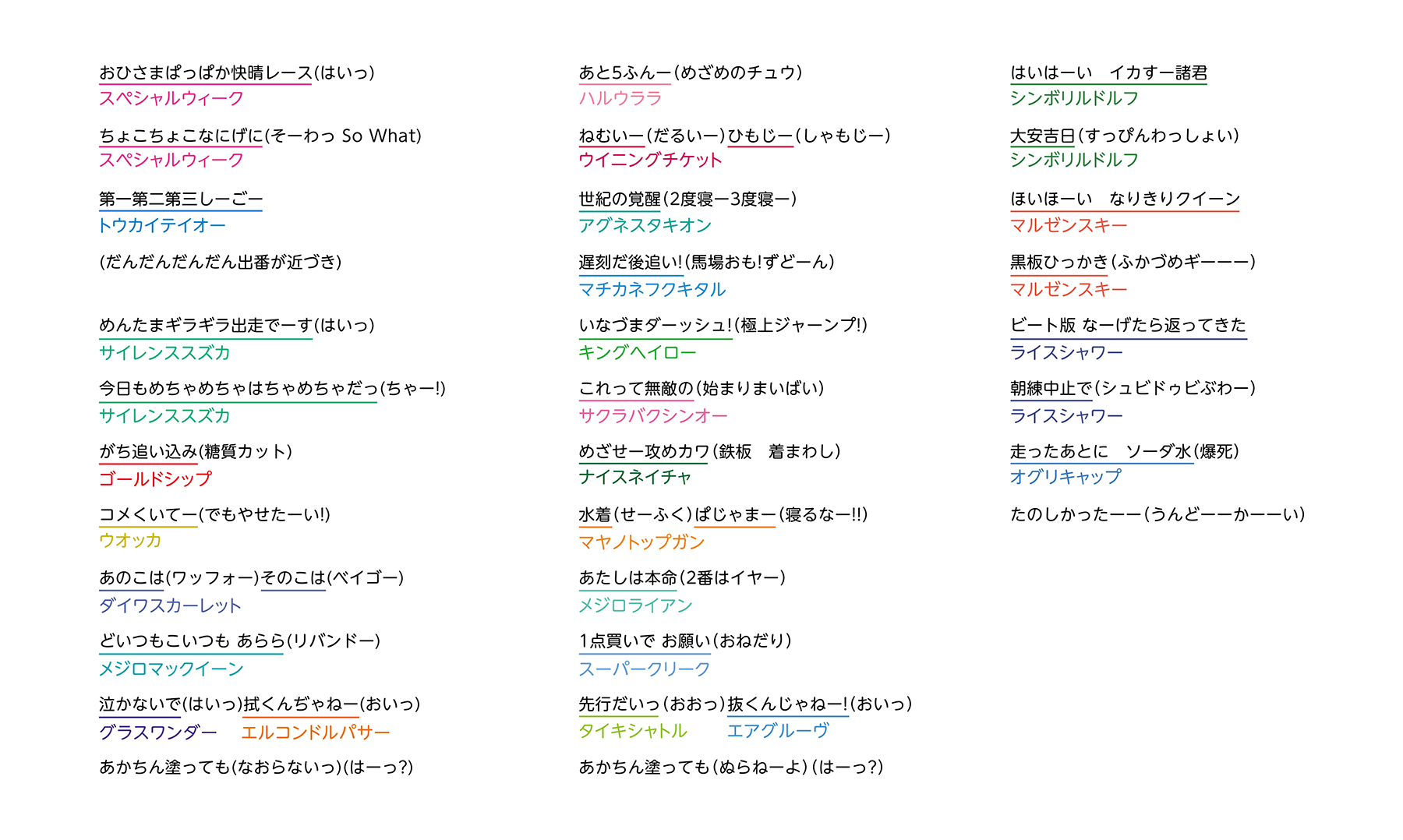 æãå¨ã®äººæ°æ² Ãã¾ã´ããä¼èª¬ ëé¢ããæè調æ»ã¢ã³ã±ã¼ãã宿½ä¸ É£åããã£ã¦æ¥½ãã ǹã«ãã®é¸æè¢ã好ã Togetter from pbs.twimg.com シニア級(3年目)の1月前半、「担当ウマ娘とトレーナーが商店街の店で買い物をするともらえる福引券で福引きに挑戦する」というイベントが発生する。 そして福引きの特賞は超ギガレアな《温泉旅行券》!! …正確には『温泉旅館のペア宿泊券』である。 しかし、旅行券の当選確率は低確率(!)であり、 もし仮に当選できたとしても、すぐに旅行券を使うことはできない…。 その《温泉旅行券》を使うには、uraファイナルズで優勝する必要があるのである。 つまり、「《温泉旅行券》を引き当てた状態で担当ウマ娘の『うまぴょい伝説』のウイニングライブを見る」ことで 満を持して担当ウマ娘と温泉旅行に出かけられるのだ。 もし達成できたのであれば、今までの苦労が報われること間違いなしだろう。 この温泉旅行は、文字通りの「《うまぴょい伝説》の向こう側にあるモノ」であり、『運と実力を兼ね備えた者が辿り着ける境地』である。 殿堂入りしたウマ娘の二つ名の【湯けむりウマ娘】と プレイヤーの称号【温泉博士】は「真に『うまぴょいした』証」であると言えるでしょう。 尚、「“うま”ぴょい」と言われていますが、 温泉旅行イベントではウマ娘ではなくヒト娘である桐生院葵も対象になるようです。 ただし、発生条件は旅行券ではなく、 「サポートカードである《sr桐生院葵》のカードをサポートに入れて『お出かけできる状態』かつ『好感度を最大まで上げる』という条件を満たす」と、 育成終了後に「ハッピーミークと来るための下見」という名目(口実?)のもと、 桐生院葵と温泉旅行に行くイベントが発生するのだった…。 旅行券よりは条件を満たしやすいため、こちらを先に見たという人も多いようです。 Oct 02, 2018 · うまぴょい伝説誕生秘話未だ数多くの中毒者を増やし続けているという「うまぴょい伝説」。一度聞いた者はなぜか病み付きになってずっと聞き続けてしまうという魔性の楽曲である。 See full list on dic.nicovideo.jp