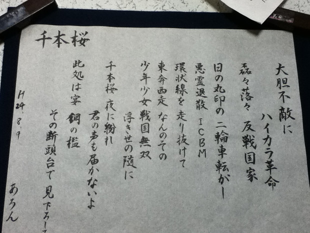 千本桜 夜ニ紛レ 君が歌い 僕は踊る 此処は宴 鋼の檻 さあ光線銃を撃ちまくれ 大胆不敵にハイカラ革命 磊々落々反戦国家 日の丸印の二輪車転がし 悪霊退散 icbm 環状線を走.