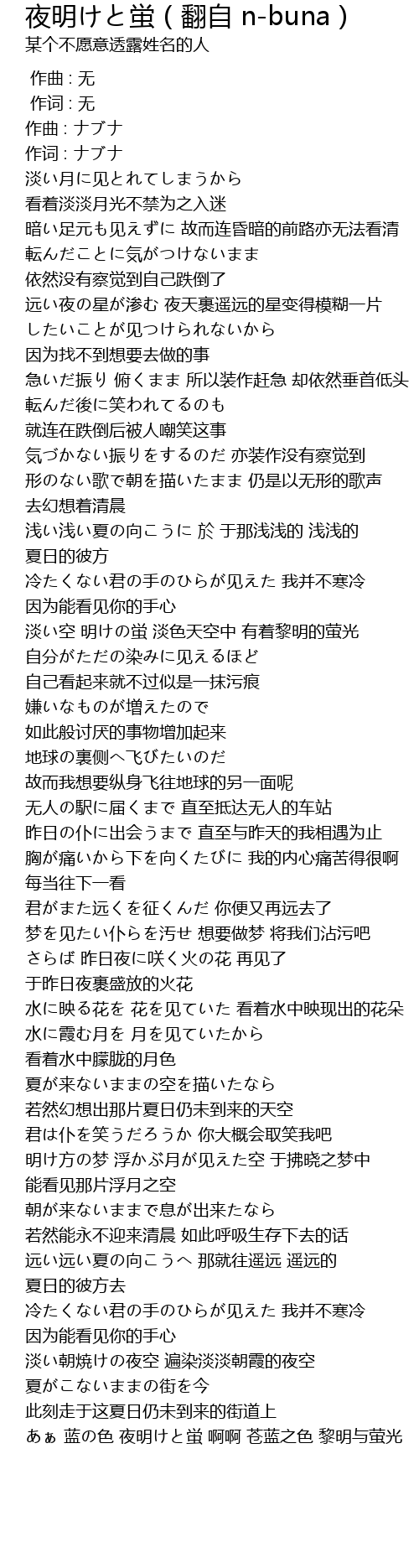 Ãããã Alekun Ťæãã¨è Dawn And Firefly Lyric Video Youtube from i.ytimg.com Jun 29, 2019 · 淡い月に見とれてしまうから 暗い足元も見えずに 転んだことに気がつけないまま 淡い月に見とれてしまうから 暗い足元も見えずに 転んだことに気がつけないまま 遠い夜の星が滲む したいことが見つけられないから 急いだ振り 俯くまま 転んだ後に笑われてるのも 気. May 17, 2020 · そうして最後にいきついた歌詞は「夜明けと蛍」。 この楽曲は、主人公が探し続けてきた「歌」の姿、そのものだったのです。 text 勝哉エイミカ
