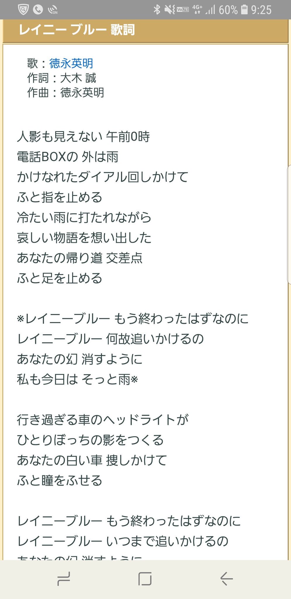 More images for 歌詞 レイニーブルー » 徳永英明の「レイニー ブルー」歌詞ページです。作詞:大木誠,作曲:徳永英明。恋する日曜日(ファーストシリーズ) 主題歌 (歌いだし)人影も見えない午前0時 歌ネットは無料の歌詞検索サービスです。 More images for 歌詞 レイニーブルー » 徳永英明 レイニー ブルー lyrics are provided for educational purposes only.