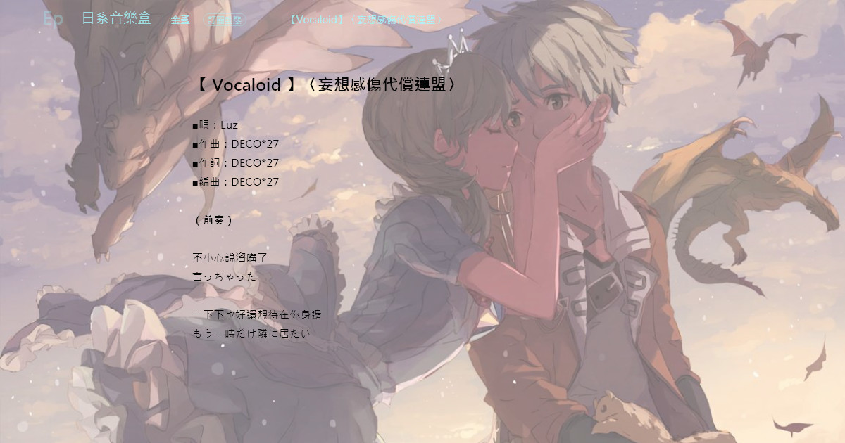 Å¦æ³æå·ä»£åé£ç Song Lyrics And Music By Deco 27 Åé³ã㯠Ãã«ã Arranged By Yon On Smule Social Singing App from c-cl.cdn.smule.com 妄想感傷代償連盟 …歌ってみました byこの子 音楽・サウンド 身勝手だって言われてもペロリ(肉)本家様【sm30067009】mix. 妄想感傷代償連盟 歌詞 妄想感傷代償連盟 deco*27 価格(税込) ¥255 ツイート 今すぐ購入する カートに追加する プレゼントする 妄想感傷代償連盟 の 歌詞 歌詞は無料で閲覧できます。 言っちゃった もう一時だけ隣りに居たい 御免なさい. だから妄想感傷代償連盟 da ka ra mousou kansyou daisyou renmei 所以妄想感傷代償聯盟 愛を懐いて理想を号んだ ai wo idaite risou wo sagenda 會懷抱著愛去宣揚理想 行き場のない愚者のメロディー yuki ba no na i gusya no merodi.